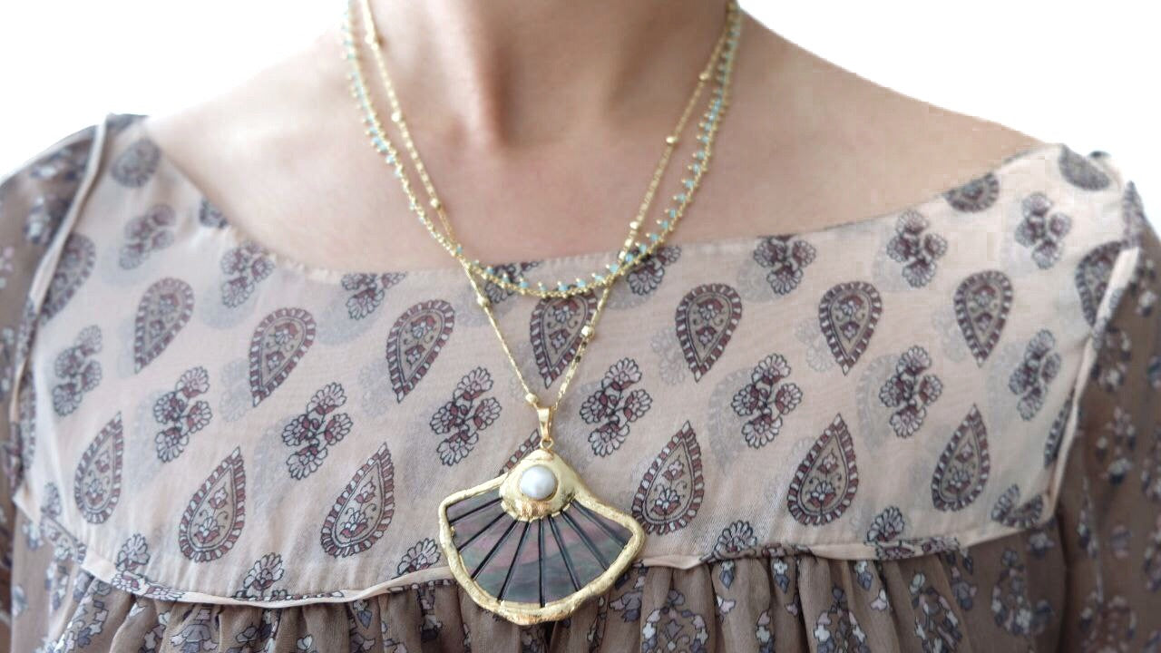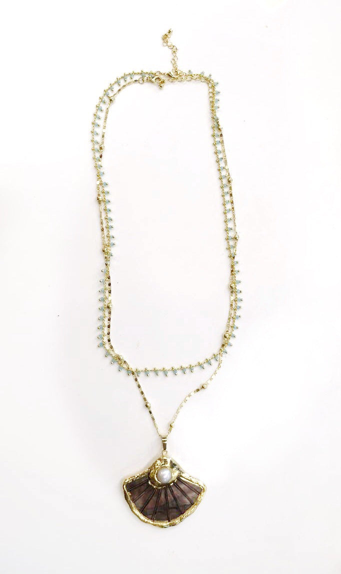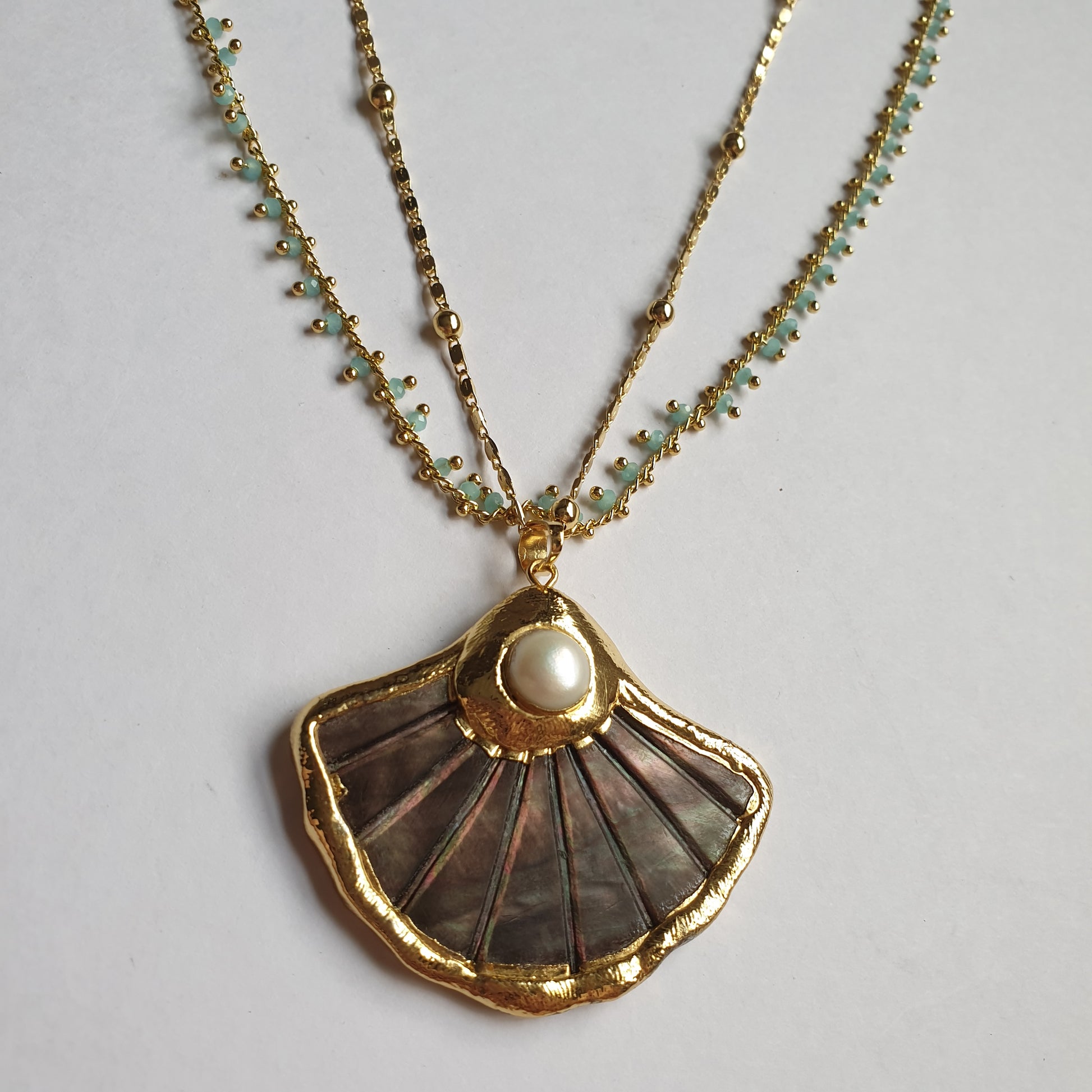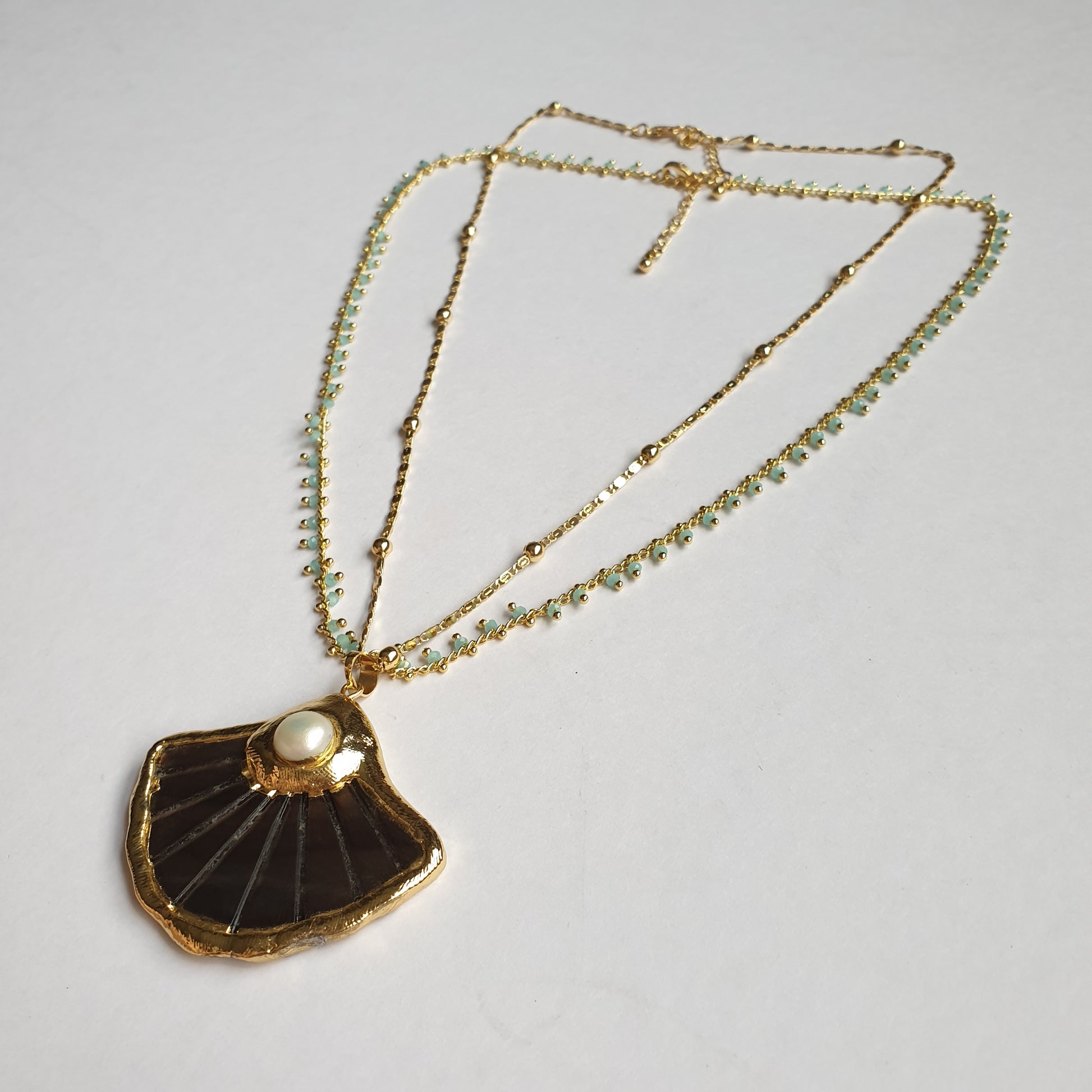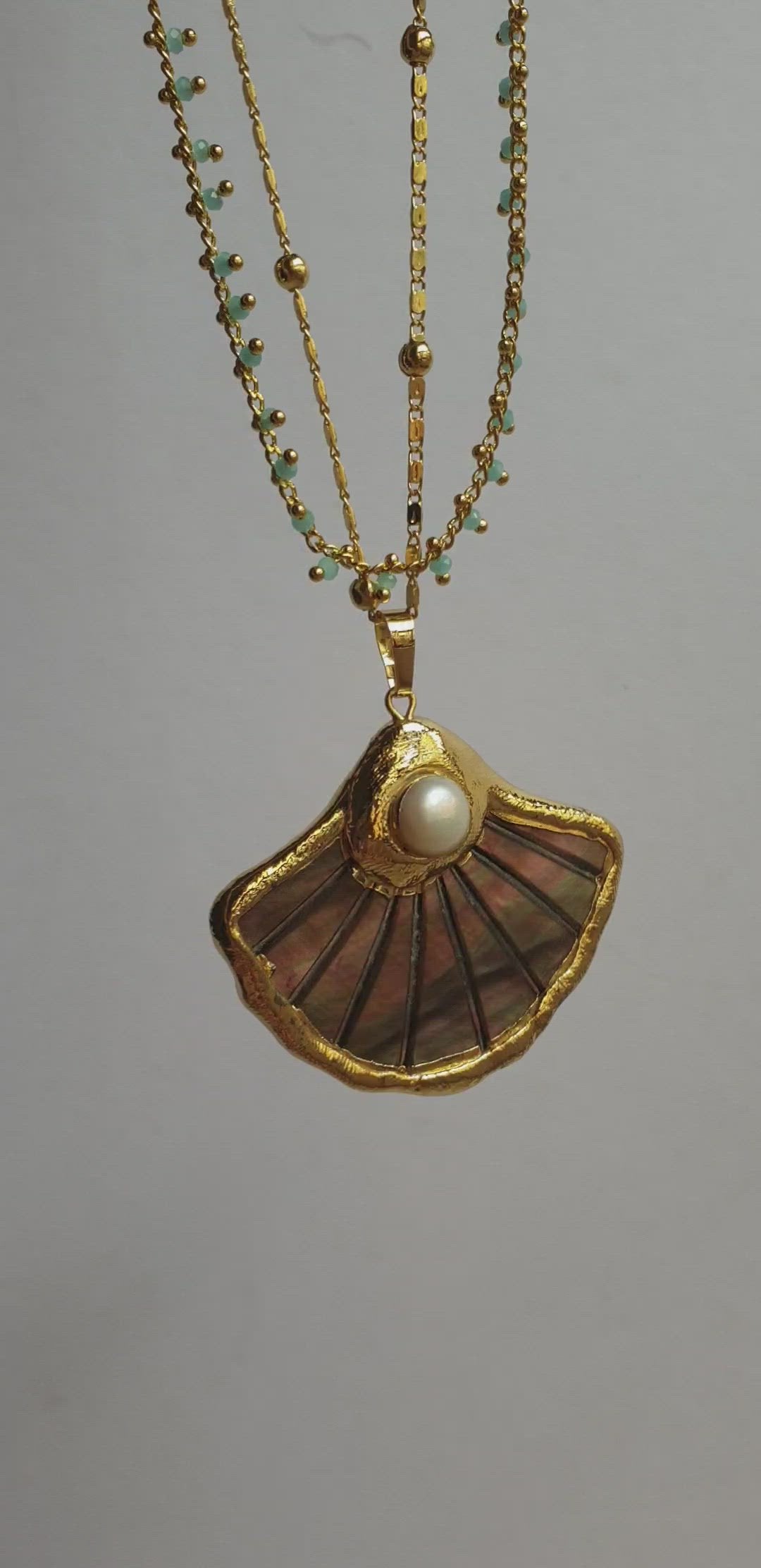 - 18k gold electroplated mother of pearl + pearl accent pendant; 18k gold electroplated chain