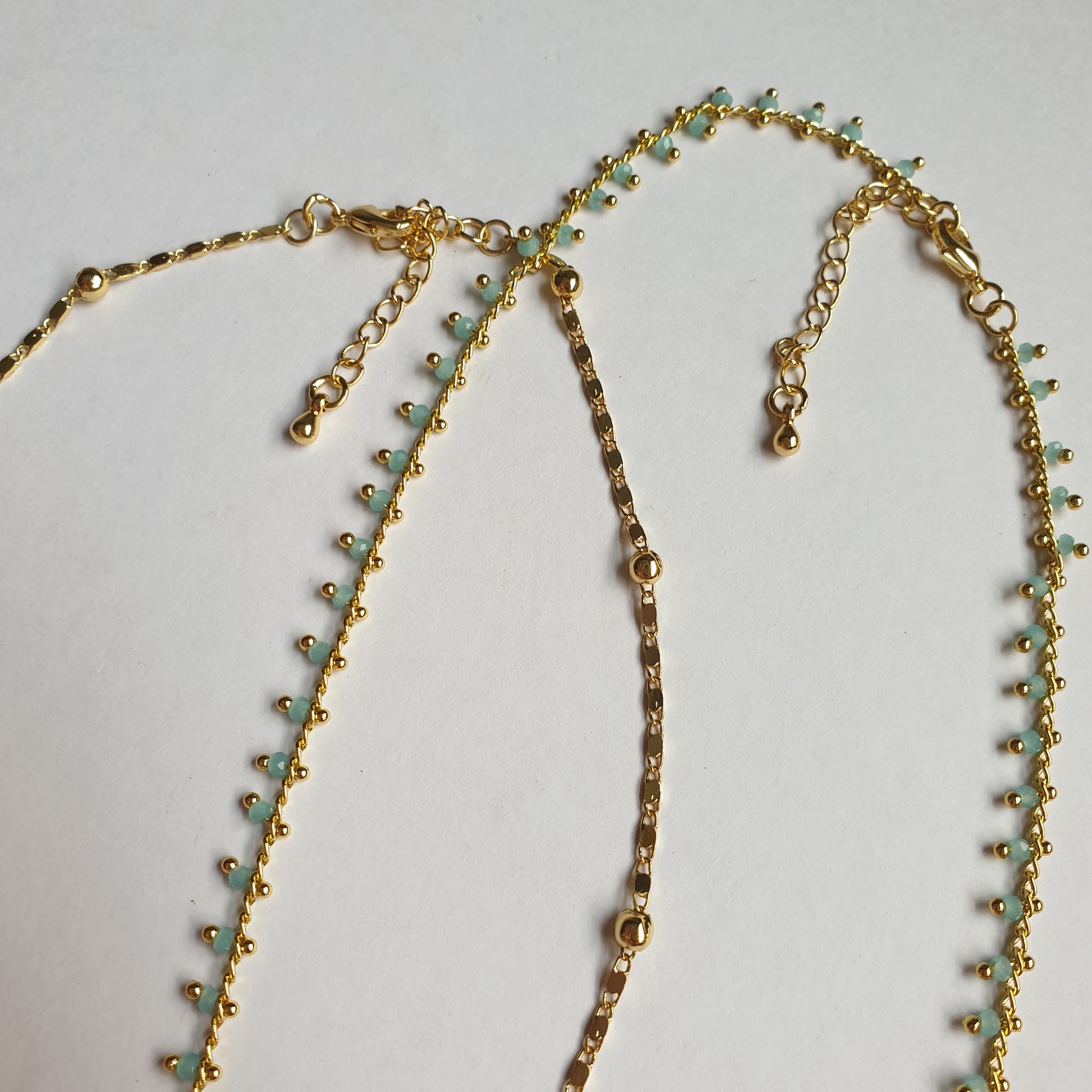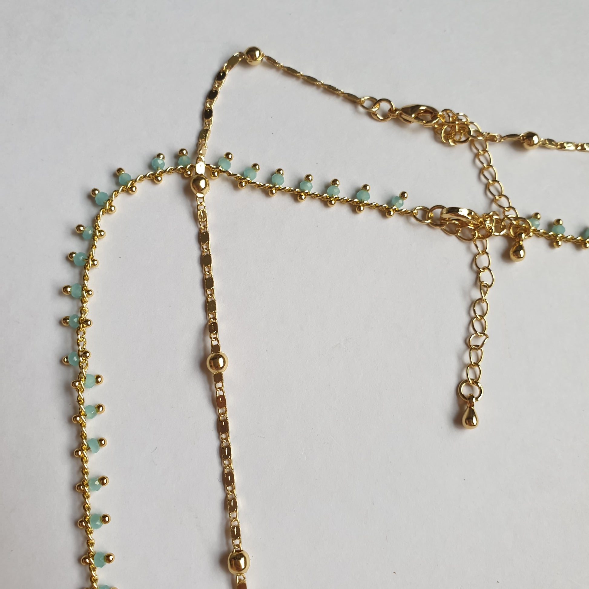 We love how the light teal crystals offer a gorgeous pop of color against the mauve-toned mother of pearl pendant.