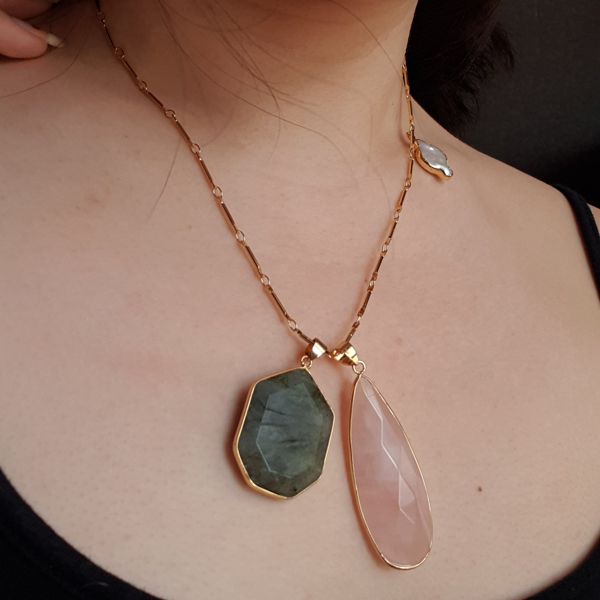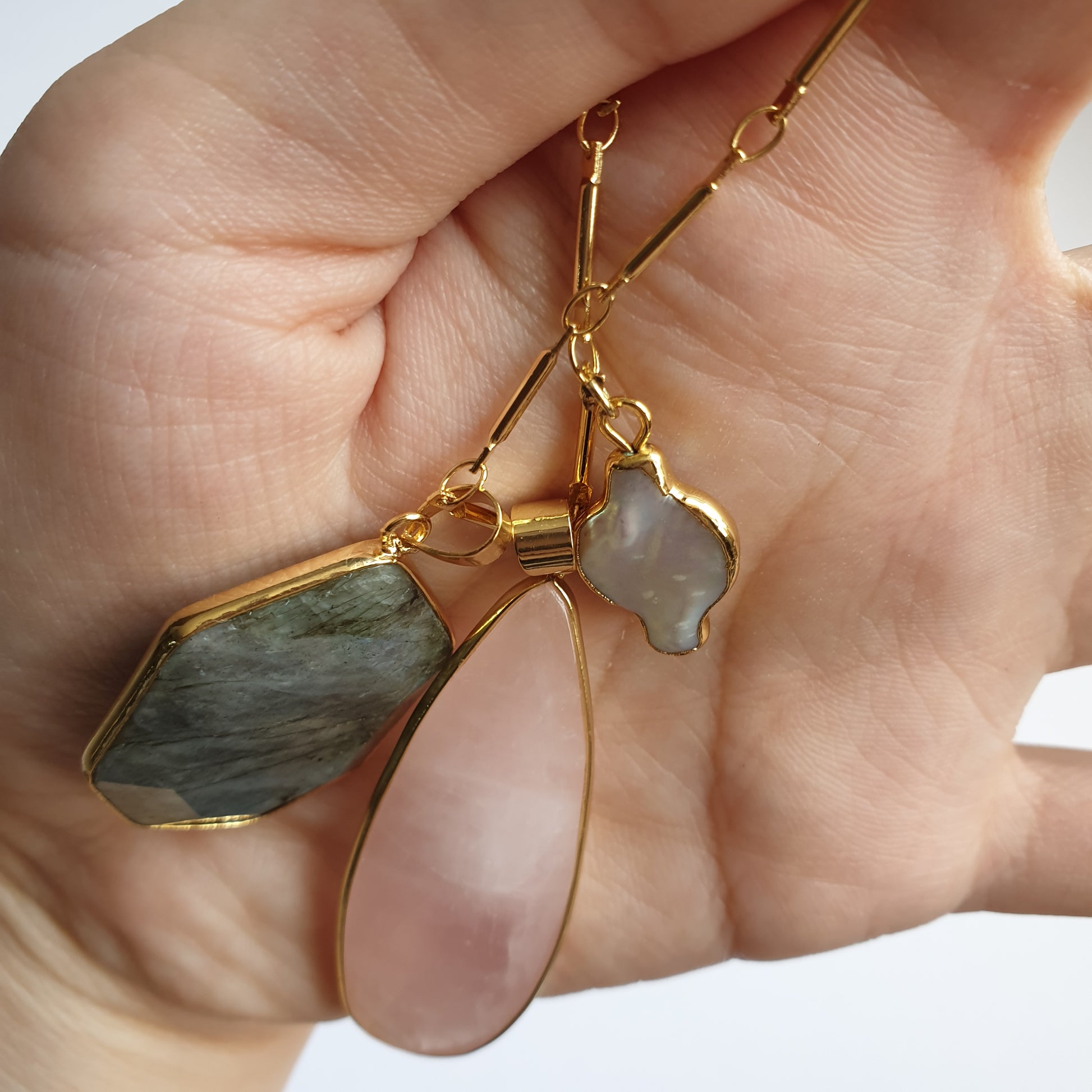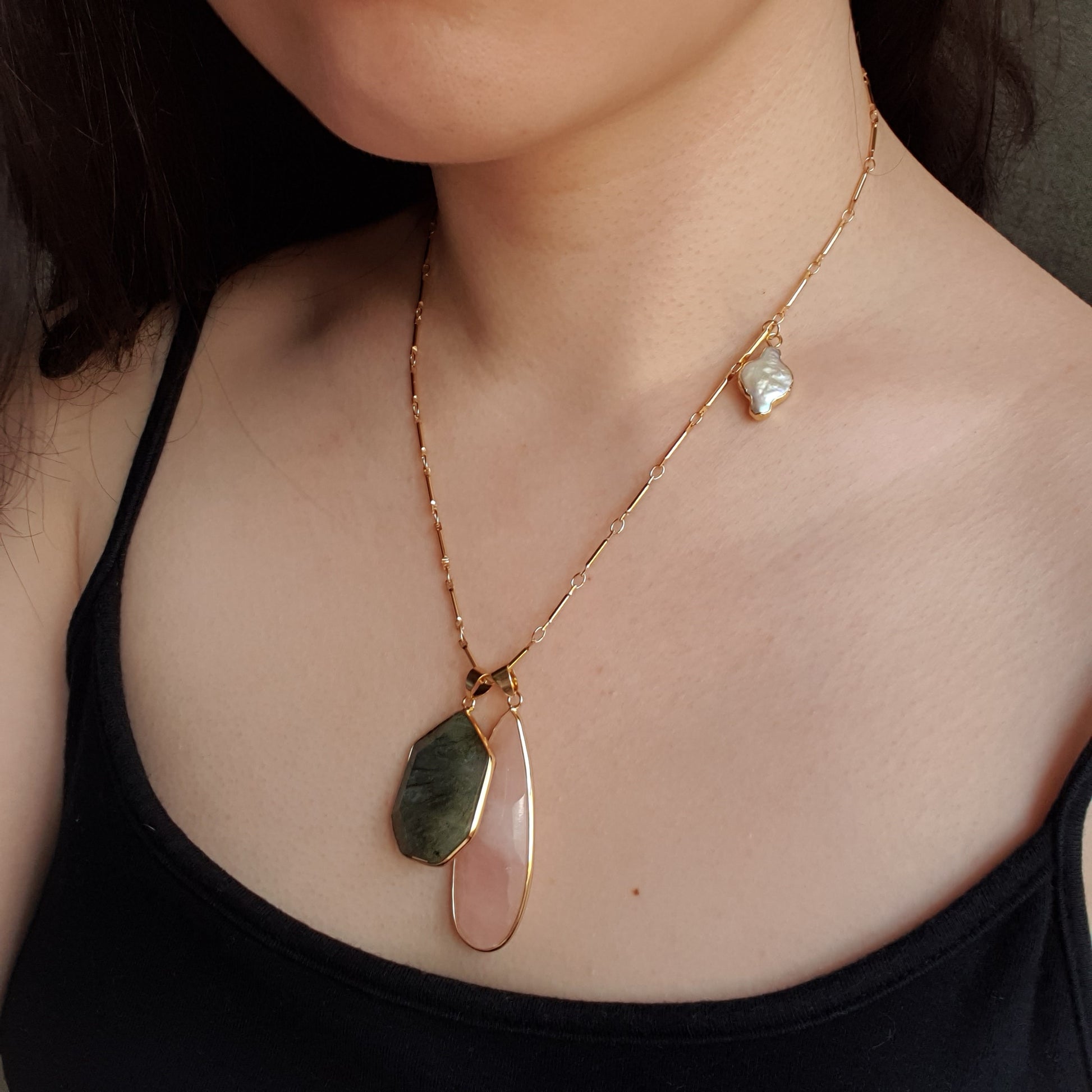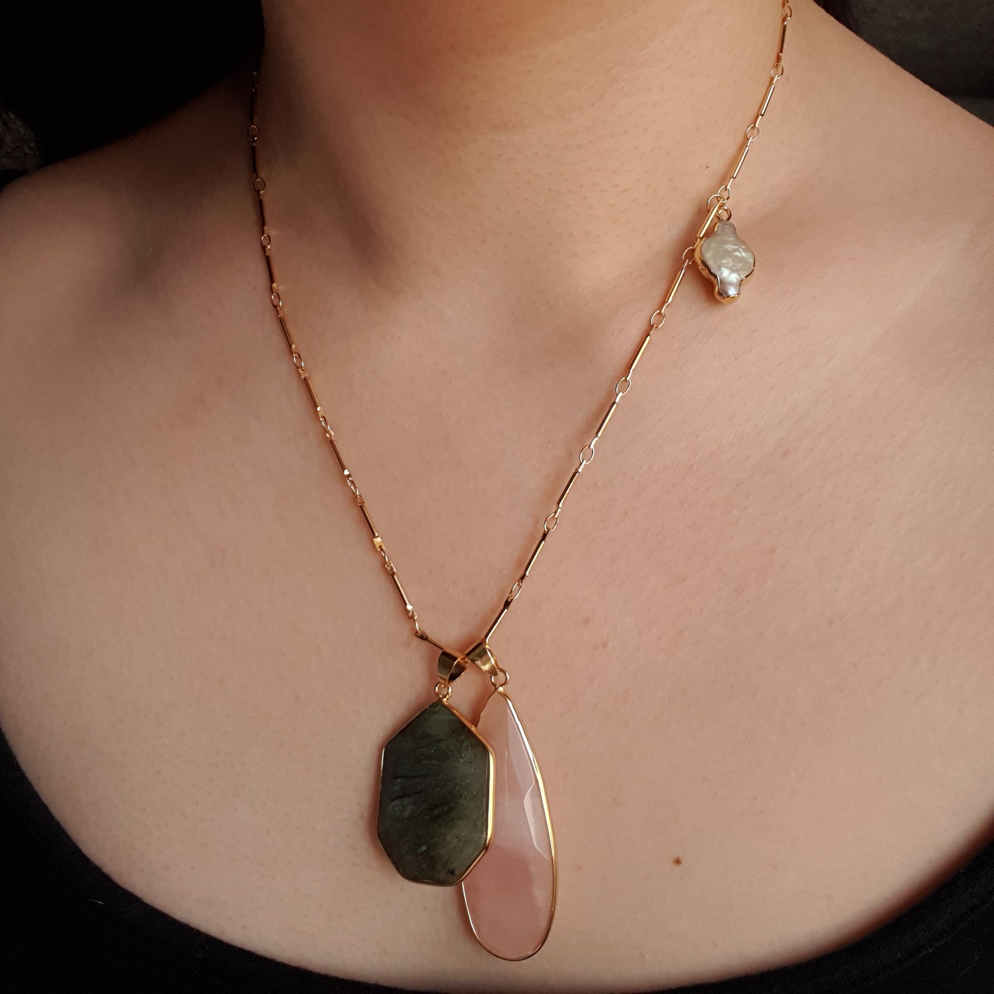 This piece was designed to be worn as shown on the model, with the pearl charm set asymmetrically to the side. Of course, it will be just as chic worn with all the charms together in the center!