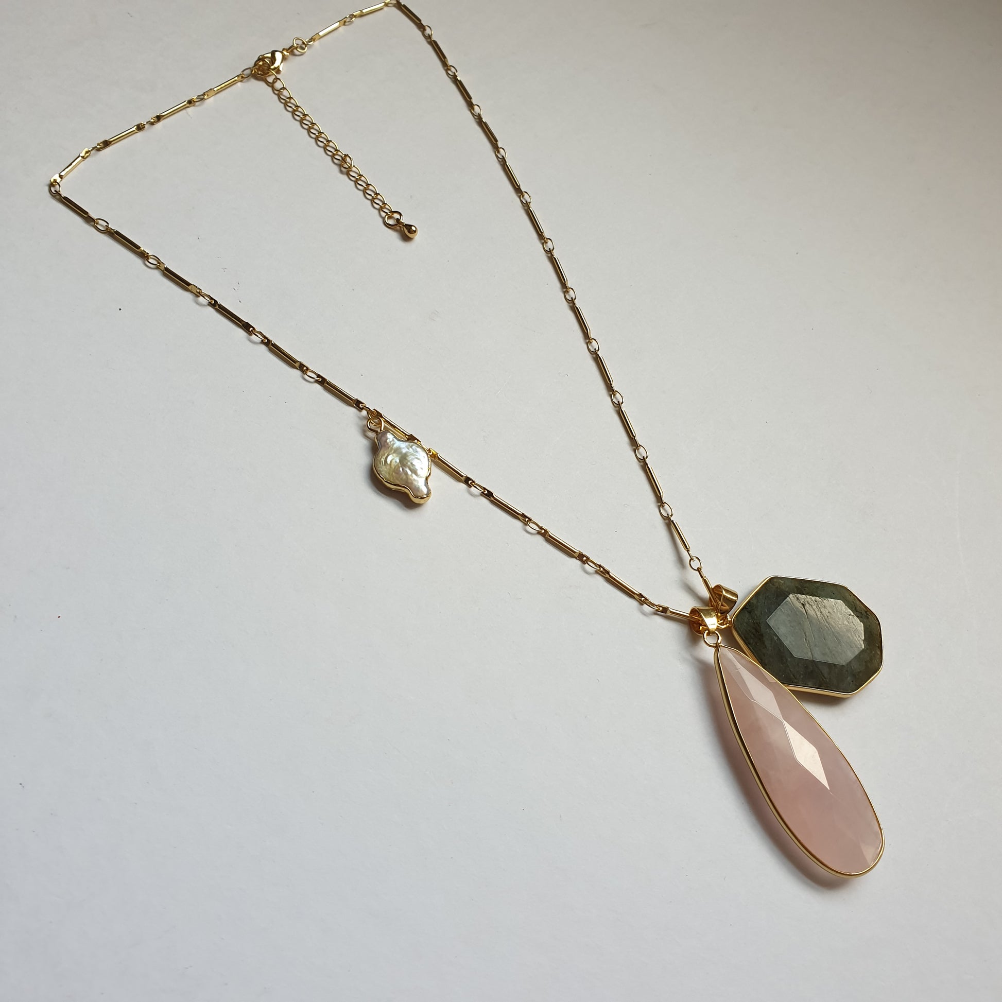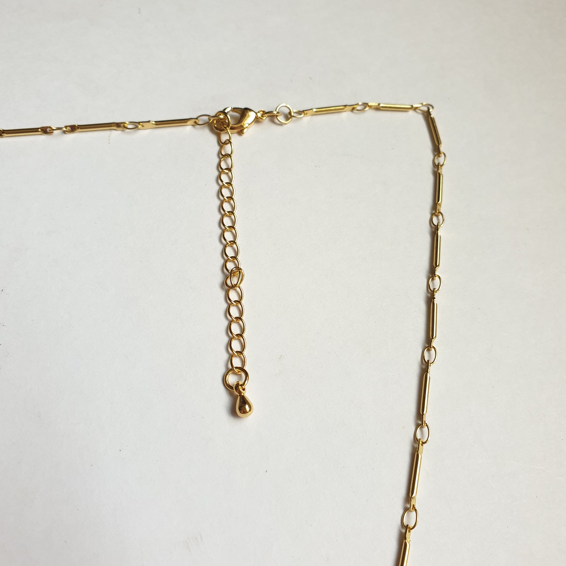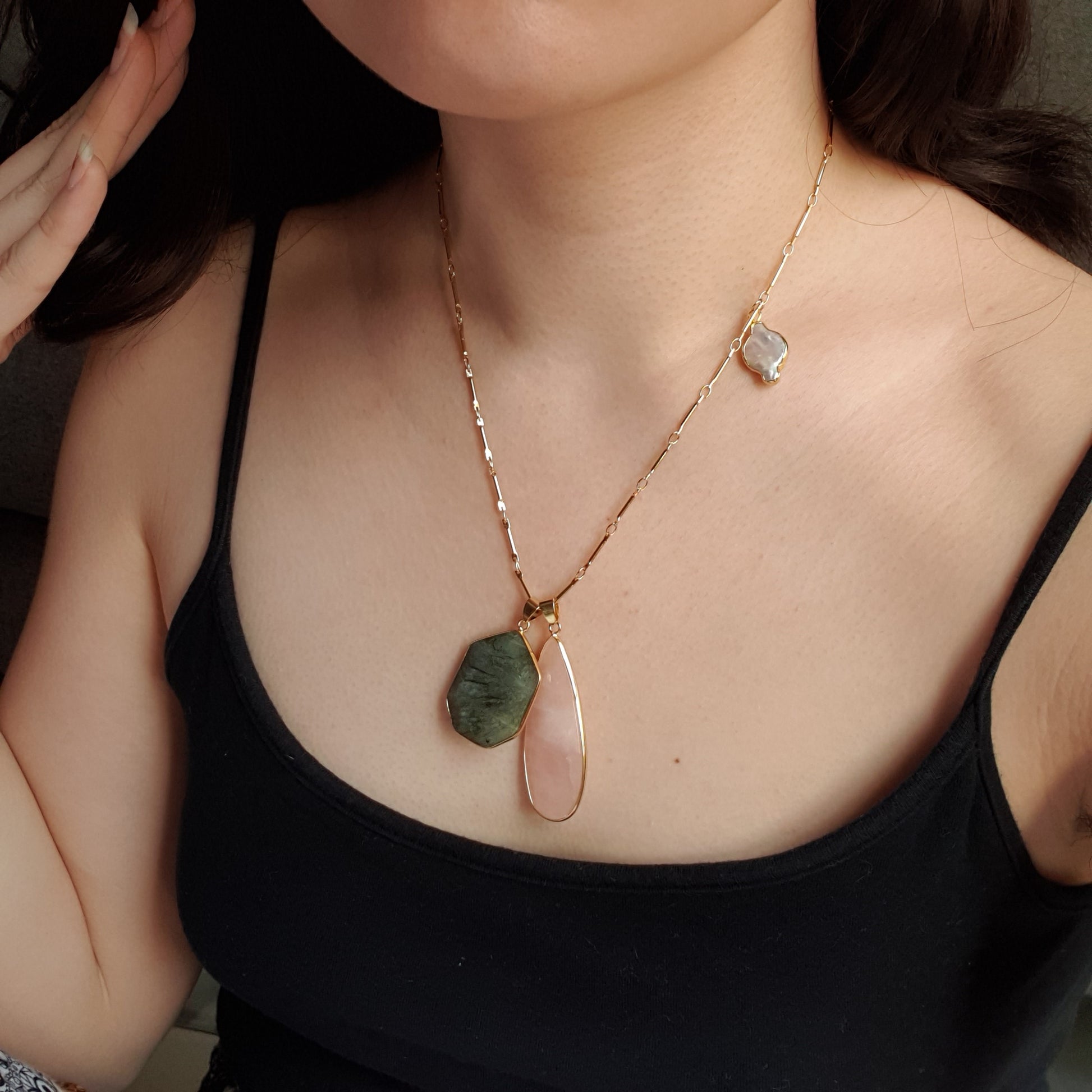 This piece was designed to be worn as shown on the model, with the pearl charm set asymmetrically to the side. Of course, it will be just as chic worn with all the charms together in the center!