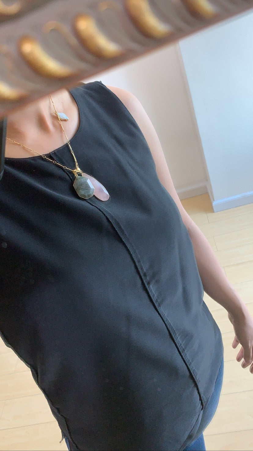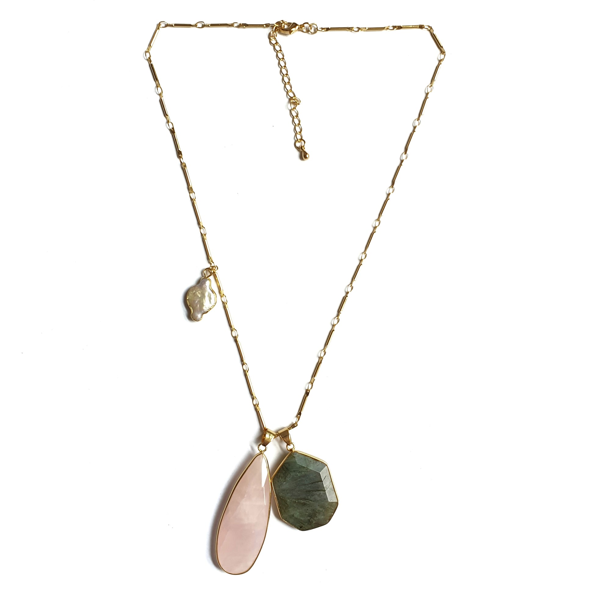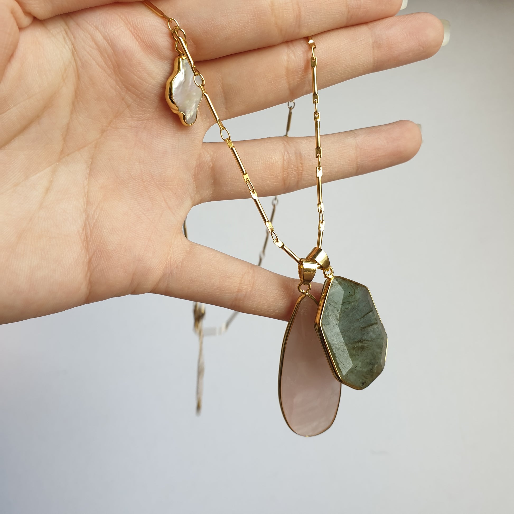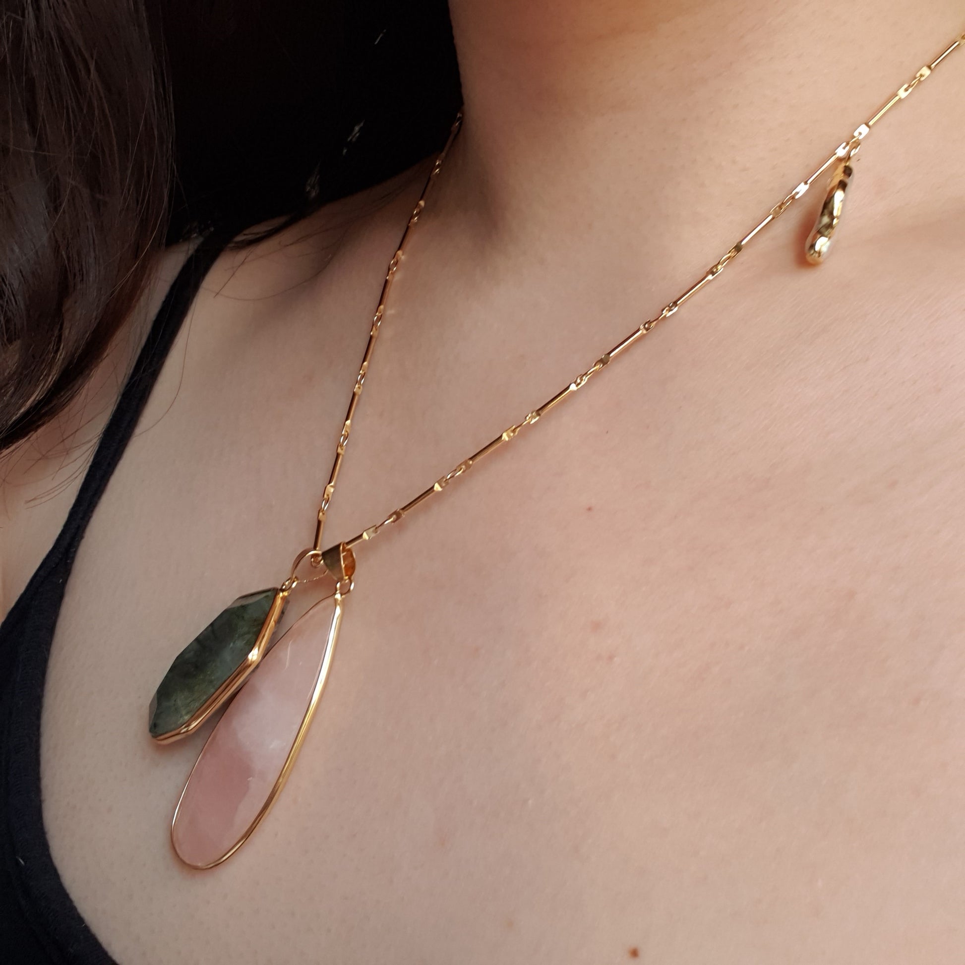 This piece was designed to be worn as shown on the model, with the pearl charm set asymmetrically to the side. Of course, it will be just as chic worn with all the charms together in the center!