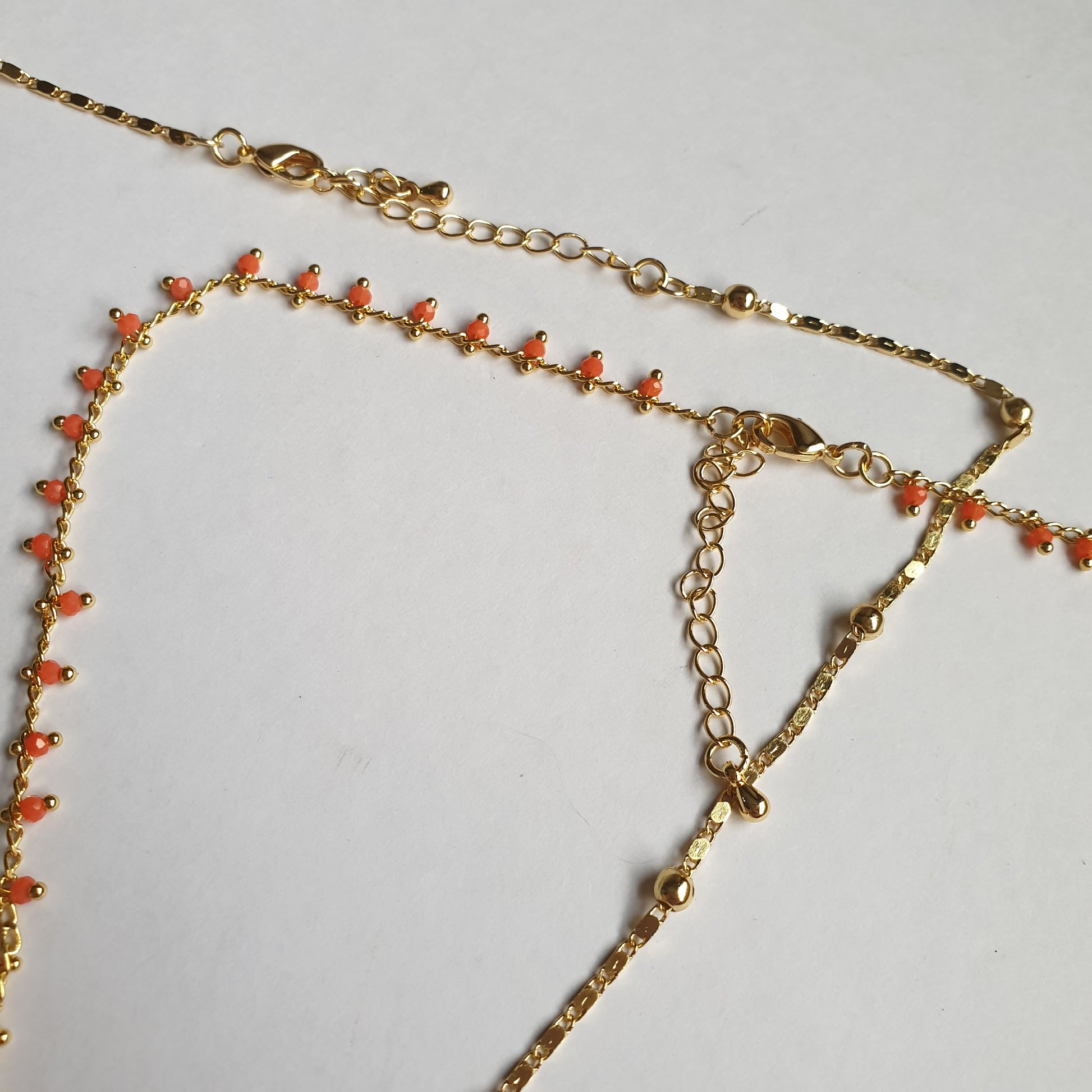 - 18k Gold electroplated; coral-hued crystal beads